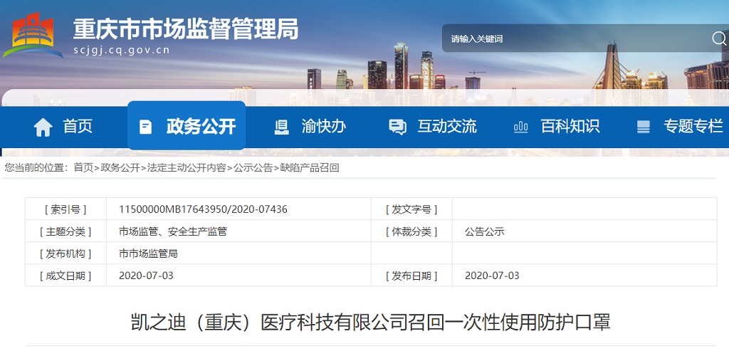 中國(guó)質(zhì)量新聞網(wǎng)訊 據(jù)重慶市市場(chǎng)監(jiān)督管理局網(wǎng)站2020年7月3日消息,日前,凱之迪(重慶)醫(yī)療科技有限公司按照《消費(fèi)品召回管理暫行規(guī)定》的要求,向重慶市市場(chǎng)監(jiān)督管理局報(bào)告了召回計(jì)劃,將自即日起,召回2020年04月07日期間制造的型號(hào)為17.5×9.5cm的一次性使用防護(hù)口罩,涉及數(shù)量為3160盒。