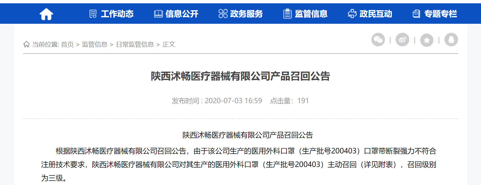中國質(zhì)量新聞網(wǎng)訊 從陜西省藥品監(jiān)督管理局官網(wǎng)獲悉,根據(jù)陜西沭暢醫(yī)療器械有限公司召回公告,由于該公司生產(chǎn)的醫(yī)用外科口罩(生產(chǎn)批號200403)口罩帶斷裂強力不符合注冊技術(shù)要求,陜西沭暢醫(yī)療器械有限公司對其生產(chǎn)的醫(yī)用外科口罩(生產(chǎn)批號200403)主動召回(詳見附表),召回級別為三級。