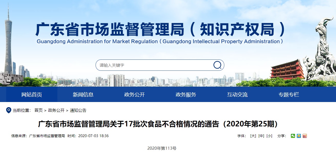 中國(guó)質(zhì)量新聞網(wǎng)訊 2020年7月3日,廣東省市場(chǎng)監(jiān)督管理局網(wǎng)站發(fā)布關(guān)于17批次食品不合格情況的通告(2020年第25期)。據(jù)通告,廣東省市場(chǎng)監(jiān)督管理局組織抽檢糧食加工品、調(diào)味品、肉制品、飲料、方便食品、速凍食品、茶葉及相關(guān)制品、蔬菜制品、食糖、淀粉及淀粉制品和食用油、油脂及其制品等11類(lèi)食品928批次樣品。根據(jù)食品安全國(guó)家標(biāo)準(zhǔn)檢驗(yàn)和判定,其中抽樣檢驗(yàn)項(xiàng)目合格樣品911批次、不合格樣品17批次,檢出微生物污染及食品添加劑超范圍超限量使用問(wèn)題。