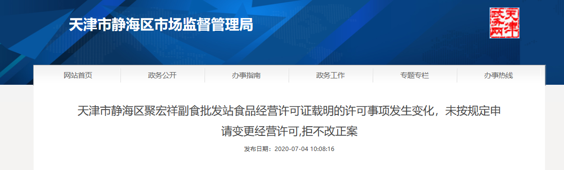 中國質(zhì)量新聞網(wǎng)訊 7月4日,天津市靜海區(qū)市場監(jiān)督管理局官網(wǎng)發(fā)布處罰決定書。