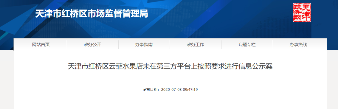 天津市紅橋區(qū)云菲水果店未在第三方平臺(tái)上按照要求進(jìn)行信息公示案 | 天津市紅橋區(qū)云菲水果店 | 92120106MA06FFHW5B | 王云菲 | 津市監(jiān)紅罰〔2020〕416號(hào) | 當(dāng)事人自2018年10月24日開(kāi)始經(jīng)營(yíng),其在美團(tuán)網(wǎng)站及實(shí)體店經(jīng)營(yíng)的商品與其營(yíng)業(yè)執(zhí)照和食品經(jīng)營(yíng)許可證上載明的內(nèi)容一致,上述行為不滿足超范圍經(jīng)營(yíng)的構(gòu)成要件。當(dāng)事人未在其美團(tuán)官方網(wǎng)頁(yè)經(jīng)營(yíng)活動(dòng)主頁(yè)面顯著位置公示其營(yíng)業(yè)執(zhí)照、食品經(jīng)營(yíng)許可證,致使鮮豐水果(天津北開(kāi)大街店)在美團(tuán)網(wǎng)站的公示信息仍為前期經(jīng)營(yíng)者蔡靜已注銷的天津市紅橋區(qū)威威水果店的營(yíng)業(yè)執(zhí)照、食品經(jīng)營(yíng)許可證,上述行為違反了通過(guò)第三方平臺(tái)進(jìn)行交易的食品經(jīng)營(yíng)者應(yīng)當(dāng)在其經(jīng)營(yíng)活動(dòng)主頁(yè)面顯著位置公示其食品經(jīng)營(yíng)許可證的規(guī)定。 | 警告 | 《網(wǎng)絡(luò)食品安全違法行為查處辦法》第四十條 | 自覺(jué)履行 | 天津市紅橋區(qū)市場(chǎng)監(jiān)督管理局 | 2020年6月24日 |