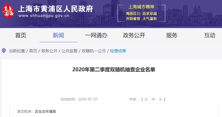 中國質(zhì)量新聞網(wǎng)訊 據(jù)上海市黃浦區(qū)人民政府網(wǎng)站2020年7月7日消息,黃浦區(qū)生態(tài)環(huán)境局公布2020年第二季度雙隨機抽查企業(yè)名單。