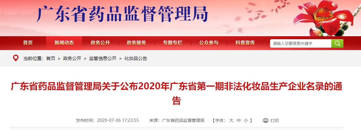 中國質(zhì)量新聞網(wǎng)訊 2020年7月6日,廣東省藥品監(jiān)督管理局網(wǎng)站發(fā)布通告,公布2020年廣東省第一期非法化妝品生產(chǎn)企業(yè)名錄。