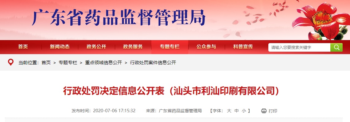 中國質(zhì)量新聞網(wǎng)訊 2020年7月6日,廣東省藥品監(jiān)督管理局網(wǎng)站發(fā)布《行政處罰決定信息公開表(汕頭市利汕印刷有限公司)》。信息顯示,該公司生產(chǎn)的“聚酯/低密度聚乙烯藥品包裝用復合膜、袋(0.2克食母生片復合膜、袋)”藥包材經(jīng)檢驗,阻隔性能(水蒸氣透過量)不合格,違反了《藥品管理法》(2015年版)第五十二條第一款的規(guī)定。