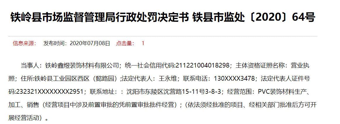 當(dāng)事人:鐵嶺鑫煜裝飾材料有限公司;統(tǒng)一社會信用代碼:211221004018298;主體資格證照名稱:營業(yè)執(zhí)照;住所:鐵嶺縣工業(yè)園區(qū)西區(qū)(懿路園);法定代表人:王永維;聯(lián)系電話:130XXXX3478;法定代表人證件號碼:232321XXXXXXXX2951;聯(lián)系地址::沈陽市東陵區(qū)沈營路15-11號3-8-3;經(jīng)營范圍:PVC裝飾材料生產(chǎn)、加工、銷售(經(jīng)營項目中涉及前置審批的憑前置審批批件經(jīng)營);(依法須經(jīng)批準(zhǔn)的項目、經(jīng)相關(guān)部門批準(zhǔn)后方可開展經(jīng)營活動)。
