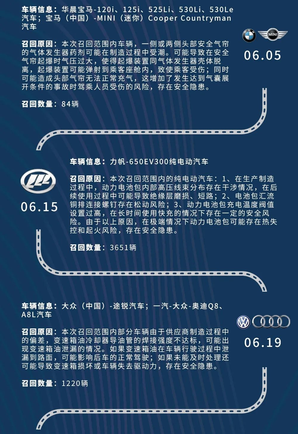 2020年6月,共15家汽車生產企業(yè)向國家市場監(jiān)督管理總局備案了召回計劃,宣布召回共計68.33萬輛汽車。