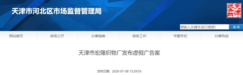中國(guó)質(zhì)量新聞網(wǎng)訊 7月8日,天津市河北區(qū)市場(chǎng)監(jiān)督管理局公開關(guān)于天津市宏隆織物廠發(fā)布虛假?gòu)V告案的行政處罰決定。