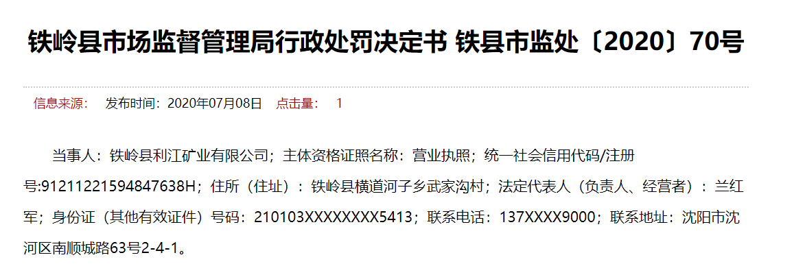 當事人:鐵嶺縣利江礦業(yè)有限公司;主體資格證照名稱:營業(yè)執(zhí)照;統(tǒng)一社會信用代碼/注冊號:91211221594847638H;住所(住址):鐵嶺縣橫道河子鄉(xiāng)武家溝村;法定代表人(負責人、經營者):蘭紅軍;身份證(其他有效證件)號碼:210103XXXXXXXX5413;聯(lián)系電話:137XXXX9000;聯(lián)系地址:沈陽市沈河區(qū)南順城路63號2-4-1。