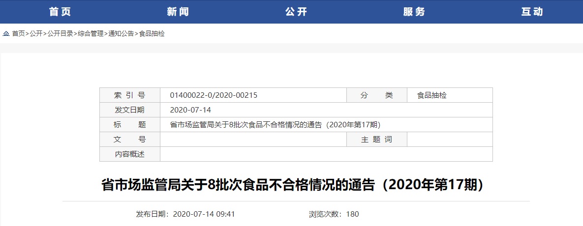 中國(guó)質(zhì)量新聞網(wǎng)訊 2020年7月14日,江蘇省市場(chǎng)監(jiān)督管理局網(wǎng)站發(fā)布《省市場(chǎng)監(jiān)管局關(guān)于8批次食品不合格情況的通告(2020年第17期)》。