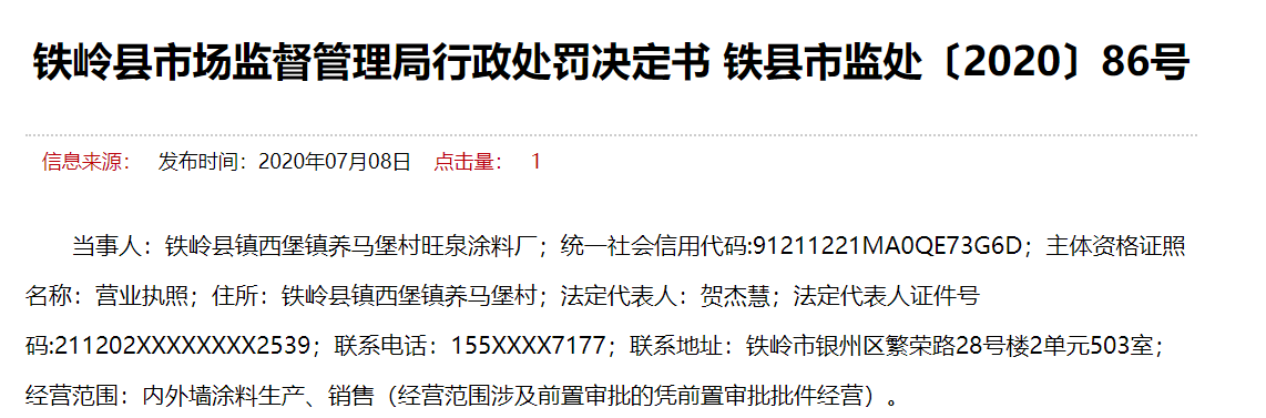 當(dāng)事人:鐵嶺縣鎮(zhèn)西堡鎮(zhèn)養(yǎng)馬堡村旺泉涂料廠;統(tǒng)一社會(huì)信用代碼:91211221MA0QE73G6D;主體資格證照名稱:營(yíng)業(yè)執(zhí)照;住所:鐵嶺縣鎮(zhèn)西堡鎮(zhèn)養(yǎng)馬堡村;法定代表人:賀杰慧;法定代表人證件號(hào)碼:211202XXXXXXXX2539;聯(lián)系電話:155XXXX7177;聯(lián)系地址:鐵嶺市銀州區(qū)繁榮路28號(hào)樓2單元503室;經(jīng)營(yíng)范圍:內(nèi)外墻涂料生產(chǎn)、銷(xiāo)售(經(jīng)營(yíng)范圍涉及前置審批的憑前置審批批件經(jīng)營(yíng))。