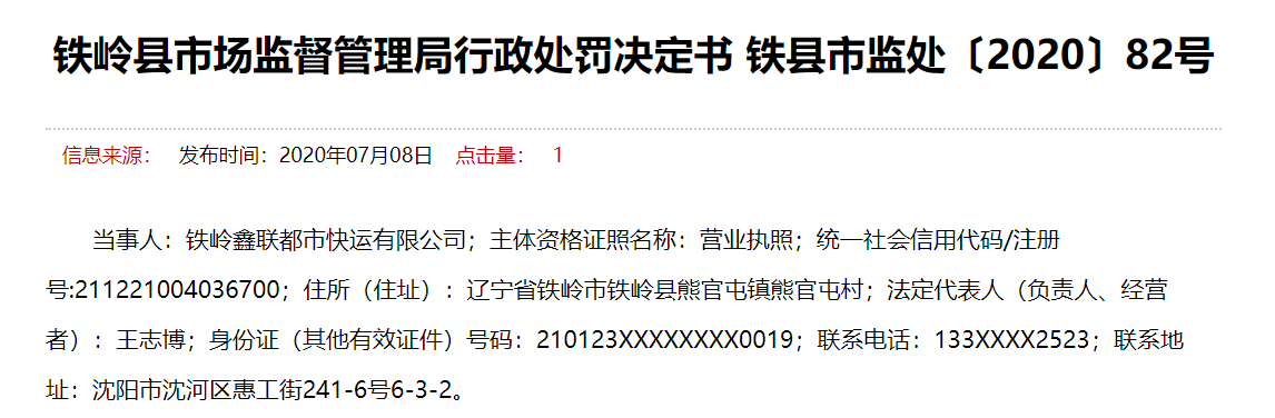 當(dāng)事人:鐵嶺鑫聯(lián)都市快運(yùn)有限公司;主體資格證照名稱:營(yíng)業(yè)執(zhí)照;統(tǒng)一社會(huì)信用代碼/注冊(cè)號(hào):211221004036700;住所(住址):遼寧省鐵嶺市鐵嶺縣熊官屯鎮(zhèn)熊官屯村;法定代表人(負(fù)責(zé)人、經(jīng)營(yíng)者):王志博;身份證(其他有效證件)號(hào)碼:210123XXXXXXXX0019;聯(lián)系電話:133XXXX2523;聯(lián)系地址:沈陽(yáng)市沈河區(qū)惠工街241-6號(hào)6-3-2。