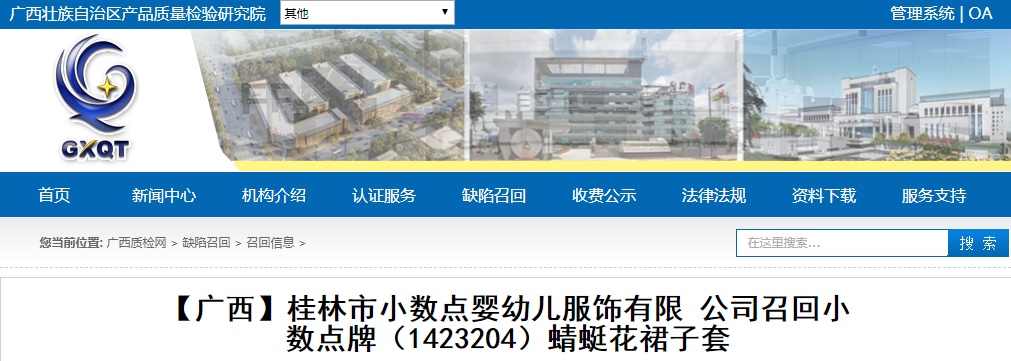 中國質量新聞網訊 據廣西質檢網2020年7月16日消息,日前,桂林市小數點嬰幼兒服飾有限公司按照《消費品召回管理暫行規(guī)定》的要求,向廣西壯族自治區(qū)市場監(jiān)督管理局報告了召回計劃,自7月10日起,召回2014年1月至2014年3月期間制造的小數點牌(1423204)蜻蜓花裙子套,涉及數量為80套。