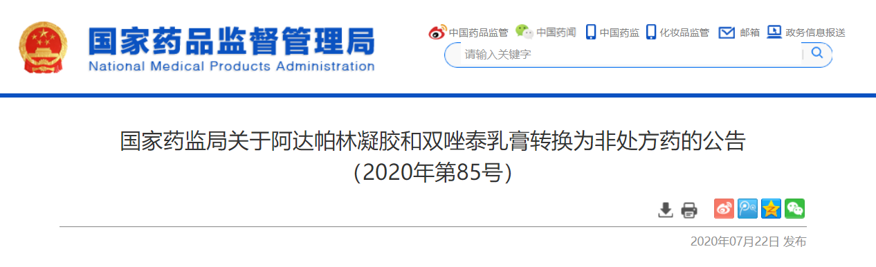 國家藥監(jiān)局關(guān)于阿達(dá)帕林凝膠和雙唑泰乳膏轉(zhuǎn)換為非處方藥的公告