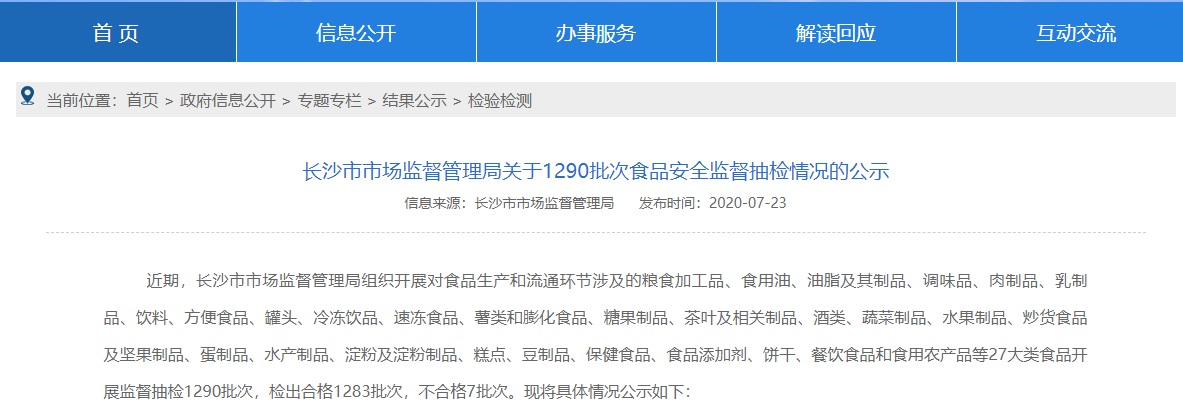 中國(guó)質(zhì)量新聞網(wǎng)訊 2020年7月23日,長(zhǎng)沙市市場(chǎng)監(jiān)督管理局網(wǎng)站發(fā)布關(guān)于1290批次食品安全監(jiān)督抽檢情況的公示。