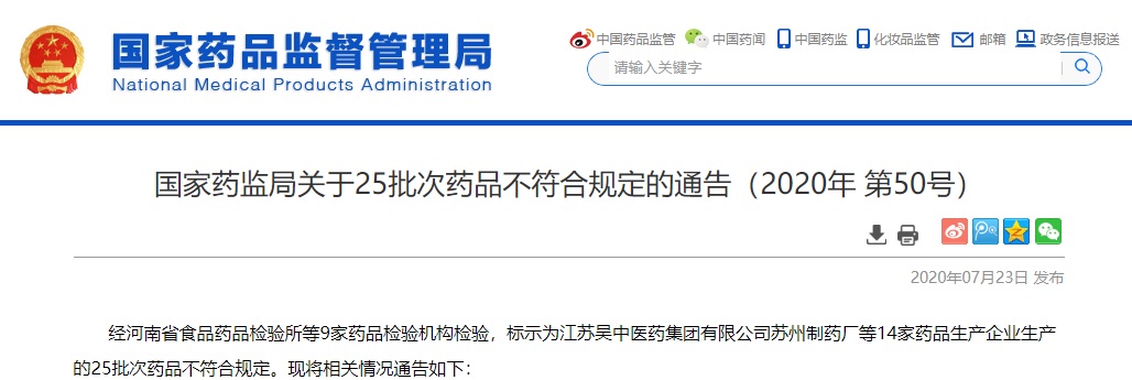 中國質量新聞網訊 2020年7月23日,國家藥品監(jiān)督管理局網站發(fā)布《國家藥監(jiān)局關于25批次藥品不符合規(guī)定的通告(2020年 第50號)》稱,經河南省食品藥品檢驗所等9家藥品檢驗機構檢驗,標示為江蘇吳中醫(yī)藥集團有限公司蘇州制藥廠等14家藥品生產企業(yè)生產的25批次藥品不符合規(guī)定。