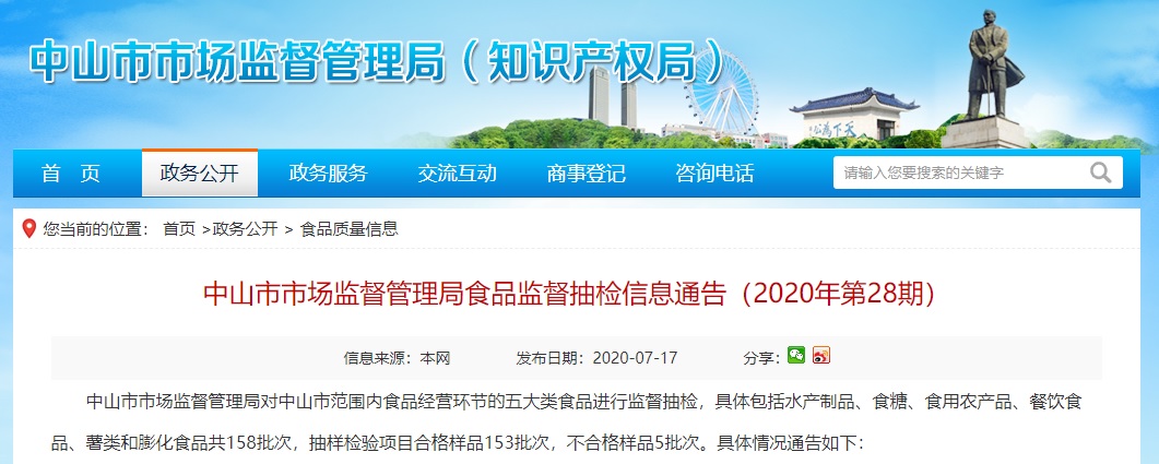 中國質(zhì)量新聞網(wǎng)訊 近日,廣東省中山市市場監(jiān)督管理局發(fā)布食品監(jiān)督抽檢信息通告(2020年第28期)。據(jù)通告,中山市市場監(jiān)督管理局對中山市范圍內(nèi)食品經(jīng)營環(huán)節(jié)的五大類食品共158批次樣品進(jìn)行監(jiān)督抽檢,抽樣檢驗(yàn)項(xiàng)目合格樣品153批次,不合格樣品5批次。