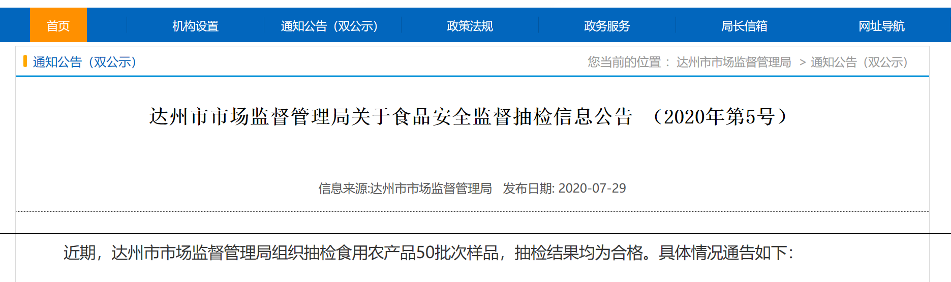 中國質(zhì)量新聞網(wǎng)訊 7月29日,四川達(dá)州市市場監(jiān)督管理局官網(wǎng)發(fā)布關(guān)于食品安全監(jiān)督抽檢信息公告 (2020年第5號)。近期,達(dá)州市市場監(jiān)督管理局組織抽檢食用農(nóng)產(chǎn)品50批次樣品,抽檢結(jié)果均為合格。