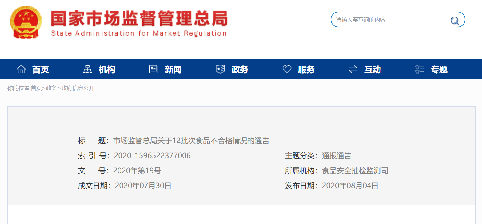 中國質(zhì)量新聞網(wǎng)訊 8月4日,市場監(jiān)管總局網(wǎng)站發(fā)布關于12批次食品不合格情況的通告。通告稱,近期,市場監(jiān)管總局組織食品安全監(jiān)督抽檢,抽取糧食加工品、食用農(nóng)產(chǎn)品、食鹽、食糖、茶葉及其相關制品、乳制品、飲料、酒類、糕點、炒貨食品及堅果制品、餅干、淀粉及淀粉制品、方便食品、薯類和膨化食品、蛋制品、豆制品、蜂產(chǎn)品、罐頭、蔬菜制品、肉制品、水產(chǎn)制品、調(diào)味品、冷凍飲品、速凍食品、糖果制品、嬰幼兒配方食品、保健食品、特殊膳食食品和食用油、油脂及其制品等29大類食品923批次樣品,檢出其中肉制品、淀粉及淀粉制品、方便食品、水產(chǎn)制品、酒類、糕點、薯類和膨化食品、炒貨食品及堅果制品等8大類食品12批次樣品不合格。發(fā)現(xiàn)的主要問題是微生物污染、其他污染物超標、食品添加劑超范圍使用、質(zhì)量指標不達標等。產(chǎn)品抽檢結果可查詢https://spcjsac.gsxt.gov.cn/。