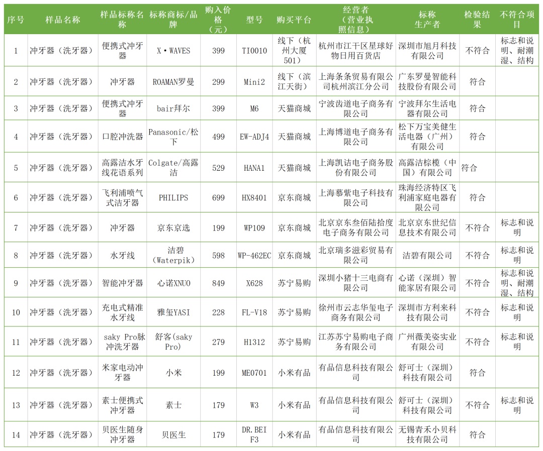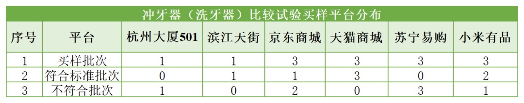 本次比較試驗對象為在杭州線下實體商店及線上各電商平臺購買的沖牙器(洗牙器)產(chǎn)品。本次活動購買了杭州大廈501、濱江天街等2家線下商場和京東商城、天貓商城、蘇寧易購、小米有品等4家線上平臺一共14個批次的沖牙器(洗牙器)產(chǎn)品;同時委托浙江省檢驗檢疫科學(xué)技術(shù)研究院作為本次比較試驗的檢測機構(gòu),依據(jù)GB4706.1-2005《家用和類似用途電器的安全 第1部分:通用要求》和GB4706.59-2008《家用和類似用途電器的安全 口腔衛(wèi)生器具的特殊要求》進行了試驗。本次沖牙器(洗牙器)比較試驗符合標(biāo)準(zhǔn)7批,不符合標(biāo)準(zhǔn)7批,符合標(biāo)準(zhǔn)率為50%。具體的情況見下表: