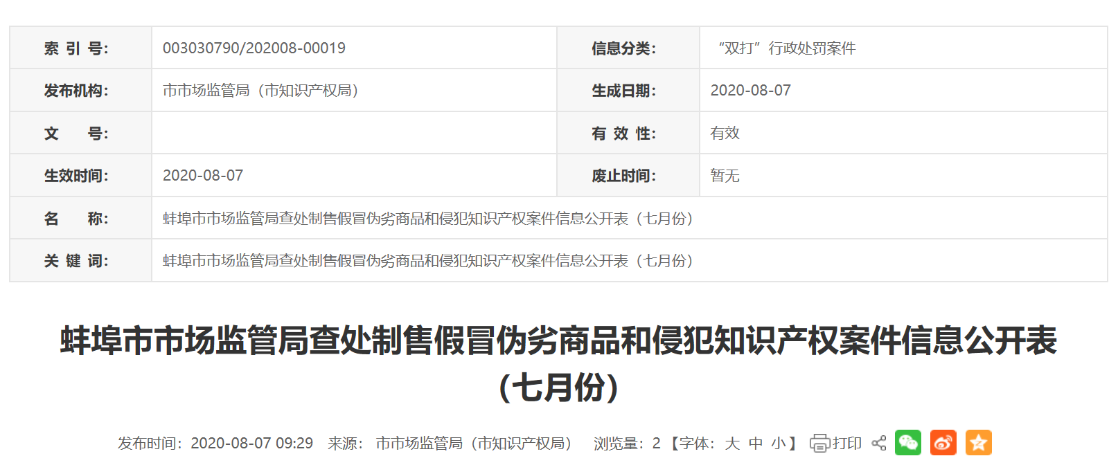 中國質(zhì)量新聞網(wǎng)訊 近日,安徽蚌埠市市場監(jiān)管局查處制售假冒偽劣商品和侵犯知識產(chǎn)權(quán)案件信息公開表(七月份)發(fā)布。