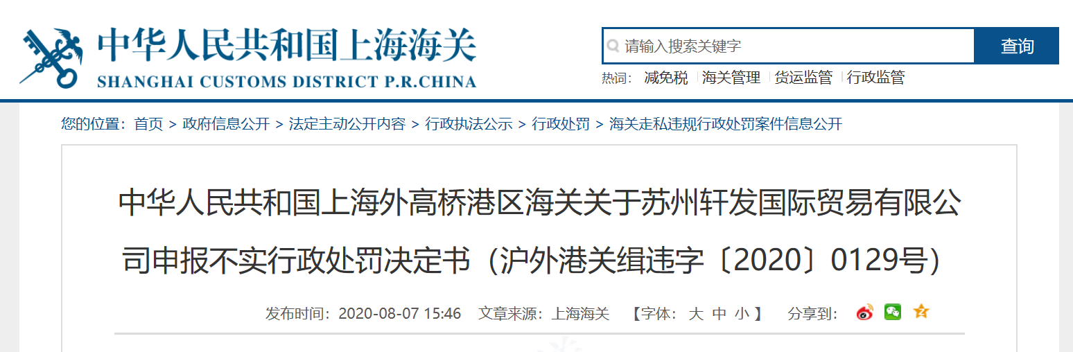 中國質(zhì)量新聞網(wǎng)訊 8月7日,上海海關(guān)官網(wǎng)發(fā)布中華人民共和國上海外高橋港區(qū)海關(guān)關(guān)于蘇州軒發(fā)國際貿(mào)易有限公司申報不實行政處罰決定書(滬外港關(guān)緝違字〔2020〕0129號)。