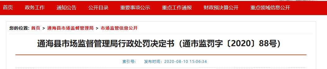 中國質(zhì)量新聞網(wǎng)訊 2020年8月10日,云南省通??h人民政府網(wǎng)站發(fā)布《通??h市場監(jiān)督管理局行政處罰決定書(通市監(jiān)罰字〔2020〕88號)》。