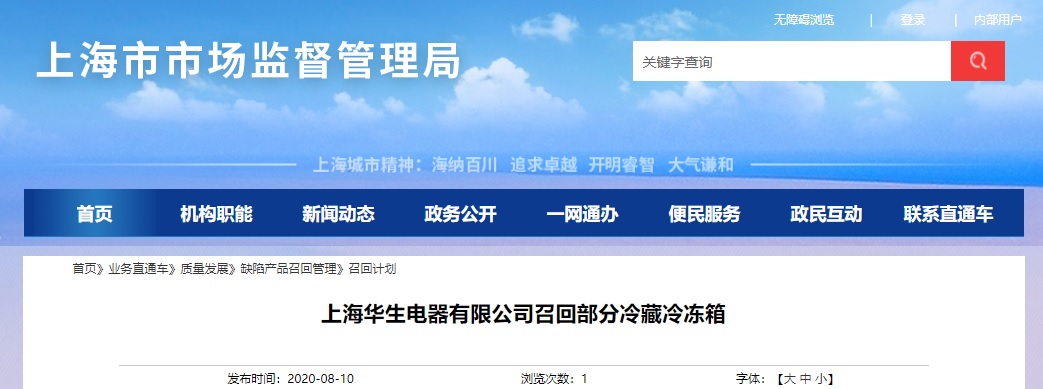 中國質(zhì)量新聞網(wǎng)訊 據(jù)上海市市場監(jiān)督管理局網(wǎng)站8月10日消息,上海華生電器有限公司召回部分冷藏冷凍箱。