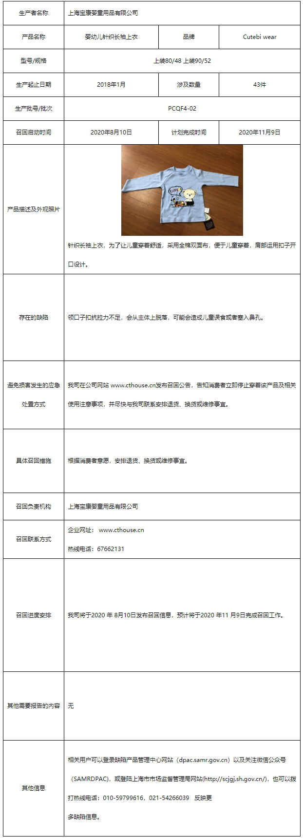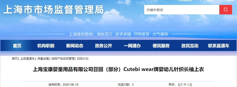 中國(guó)質(zhì)量新聞網(wǎng)訊 據(jù)上海市市場(chǎng)監(jiān)督管理局網(wǎng)站8月10日消息,上海寶康嬰童用品有限公司召回(部分)Cutebi wear牌嬰幼兒針織長(zhǎng)袖上衣。
