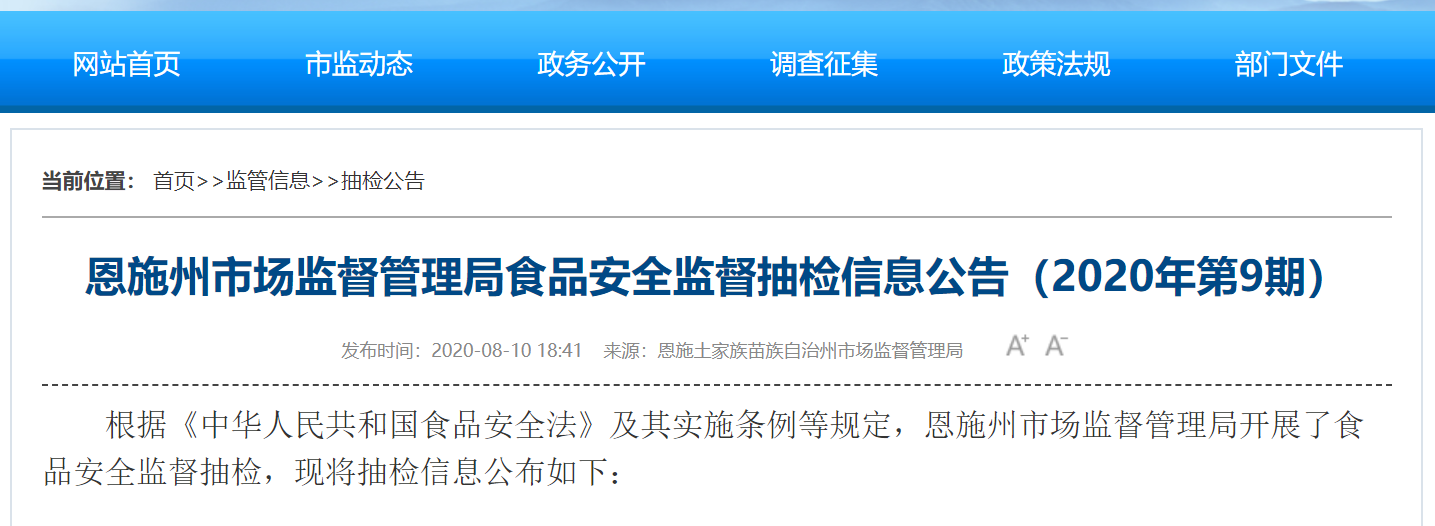 中國(guó)質(zhì)量新聞網(wǎng)訊 8月10日,湖北恩施州市場(chǎng)監(jiān)督管理局官網(wǎng)發(fā)布公告稱(chēng),根據(jù)《中華人民共和國(guó)食品安全法》及其實(shí)施條例等規(guī)定,恩施州市場(chǎng)監(jiān)督管理局開(kāi)展了食品安全監(jiān)督抽檢,現(xiàn)將抽檢信息公布如下: