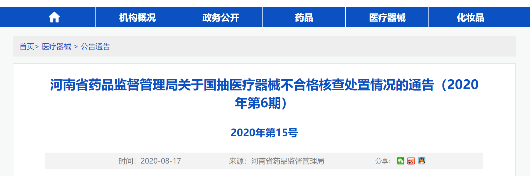 中國(guó)質(zhì)量新聞網(wǎng)訊 (記者 徐遠(yuǎn)官) 8月17日,河南省藥品監(jiān)督管理局官網(wǎng)發(fā)布關(guān)于國(guó)抽醫(yī)療器械不合格核查處置情況的通告(2020年第6期)。