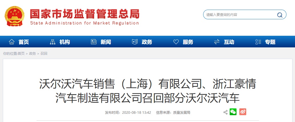 中國(guó)質(zhì)量新聞網(wǎng)訊 據(jù)國(guó)家市場(chǎng)監(jiān)督管理總局網(wǎng)站2020年8月18日消息,日前,沃爾沃汽車(chē)銷(xiāo)售(上海)有限公司、浙江豪情汽車(chē)制造有限公司根據(jù)《缺陷汽車(chē)產(chǎn)品召回管理?xiàng)l例》和《缺陷汽車(chē)產(chǎn)品召回管理?xiàng)l例實(shí)施辦法》的要求,向國(guó)家市場(chǎng)監(jiān)督管理總局備案了召回計(jì)劃。決定自2021年1月18日起召回以下進(jìn)口和國(guó)產(chǎn)沃爾沃汽車(chē),共計(jì)244800輛。