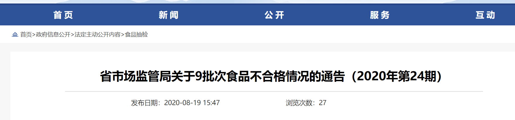 中國質(zhì)量新聞網(wǎng)訊 (記者 徐遠官) 8月19日,江蘇省市場監(jiān)管局官網(wǎng)通告9批次食品不合格情況。通告稱,近期,江蘇省市場監(jiān)督管理局完成省級食品安全監(jiān)督抽檢任務(wù)582批次,涉及餅干、炒貨食品及堅果制品、豆制品、糕點、酒類、糧食加工品、食用農(nóng)產(chǎn)品、速凍食品。根據(jù)食品安全國家標(biāo)準(zhǔn)檢驗和判定,其中抽樣檢驗項目合格樣品573批次、不合格樣品9批次。