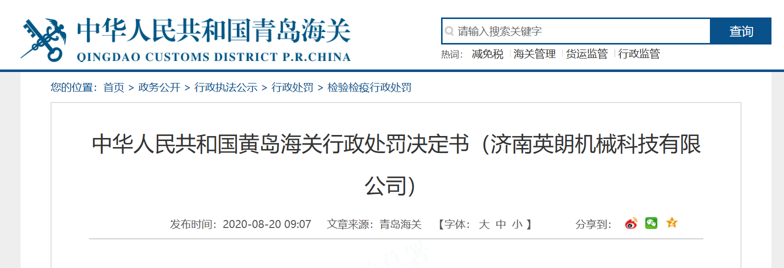 中華人民共和國黃島海關(guān)行政處罰決定書(濟南英朗機械科技有限公司)