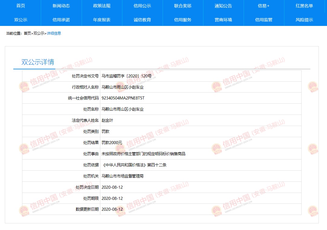 中國質(zhì)量新聞網(wǎng)訊(記者 陳娟女) 從信用中國(安徽?馬鞍山)網(wǎng)站獲悉,馬鞍山市雨山區(qū)小趙車業(yè)未按照政府價格主管部門的規(guī)定明碼標價銷售商品,馬鞍山市市場監(jiān)督管理局依據(jù)《中華人民共和國價格法》第四十二條給予罰款2000元的處罰。處罰決定書文號為馬市監(jiān)稽罰字〔2020〕120號。