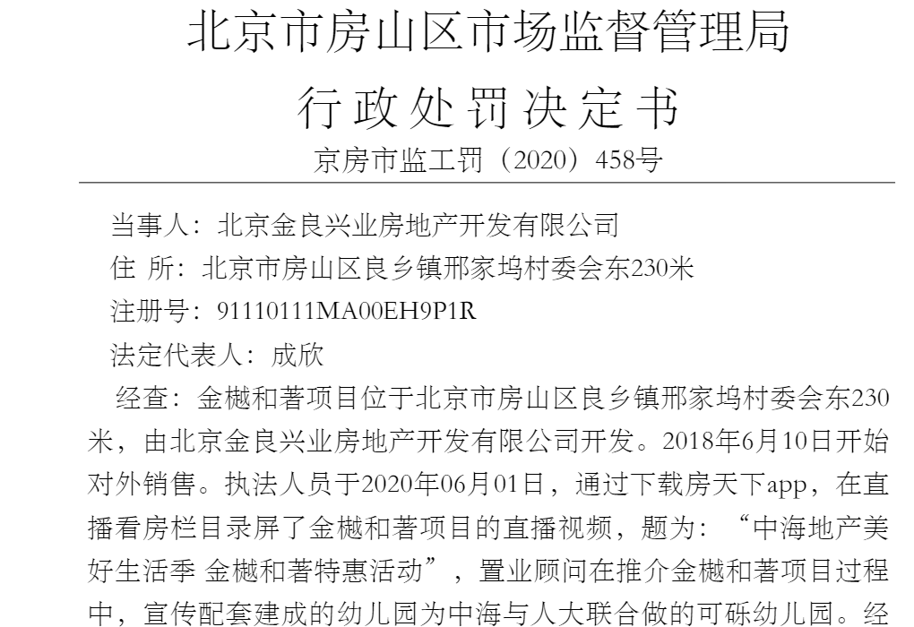 該處罰書顯示,執(zhí)法人員于2020年6月1日,通過下載房天下app,在直播看房欄目錄屏了金樾和著項(xiàng)目(位于北京市房山區(qū)良鄉(xiāng)鎮(zhèn)邢家塢村委會東230米,由金良興業(yè)地產(chǎn)開發(fā),2018年6月10日開始對外銷售)的直播視頻,題為:“中海地產(chǎn)美好生活季 金樾和著特惠活動”,置業(yè)顧問在推介金樾和著項(xiàng)目過程中,宣傳配套建成的幼兒園為中海與人大聯(lián)合做的可礫幼兒園。