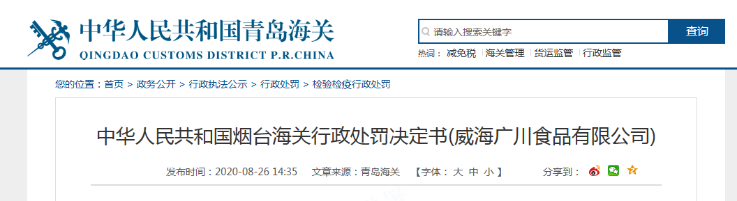 中國(guó)質(zhì)量新聞網(wǎng)訊 8月27日,青島海關(guān)網(wǎng)站發(fā)布中華人民共和國(guó)煙臺(tái)海關(guān)行政處罰決定書(shū)(威海廣川食品有限公司)。