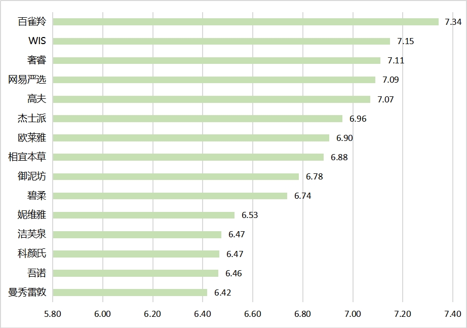 (4)溫和性:指潔面時是否有刺激或刺痛等感受。測評結果顯示,百雀羚、奢睿和WIS表現(xiàn)最好,得分分別為7.50,7.40和7.29。