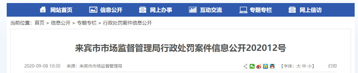 | 來賓市市場監(jiān)督管理局行政處罰案件信息公開202012號 | |||||||||