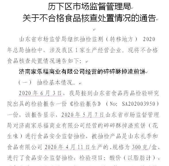 2020年6月3日,歷下區(qū)市場(chǎng)監(jiān)管局接到山東省食品藥品檢驗(yàn)研究院出具的檢驗(yàn)報(bào)告一份《檢驗(yàn)報(bào)告》(No:SA202003950)一份,該報(bào)告顯示,2020年5月7日山東省市場(chǎng)監(jiān)督管理局對(duì)濟(jì)南家樂(lè)福商業(yè)有限公司經(jīng)營(yíng)的碎碎酥掉渣煎餅(花生味)進(jìn)行食品安全監(jiān)督抽檢,被抽檢產(chǎn)品是山東禮季和食品有限公司2020年4月11日生產(chǎn)的、規(guī)格為300克/盒,進(jìn)行了食品安全監(jiān)督抽檢,檢驗(yàn)項(xiàng)目:酸價(jià)(以脂肪計(jì)),過(guò)氧化值(以脂肪計(jì)),鉛(以Pb計(jì))等20項(xiàng)。檢驗(yàn)結(jié)論:經(jīng)抽樣檢驗(yàn),過(guò)氧化值(以脂肪計(jì))項(xiàng)目不符合GB 7099-2015《食品安全國(guó)家標(biāo)準(zhǔn)糕點(diǎn)、面包》要求,檢驗(yàn)結(jié)論為不合格。