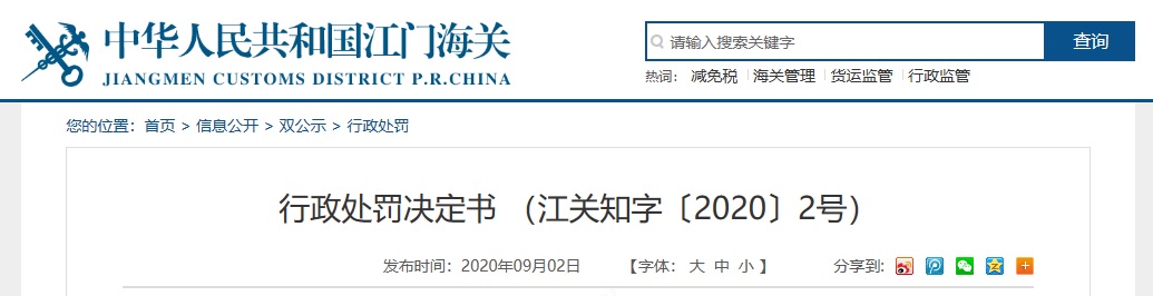 送達(dá)文書(shū): 《行政處罰決定書(shū)》(江關(guān)知字﹝2020﹞0002號(hào))