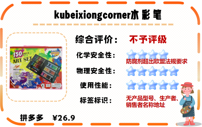 結果顯示,25款樣品中,有2款樣品(Touchcolor馬克筆套裝、kubeixiongcorner水彩筆)外包裝標識無生產(chǎn)廠家名稱、無生產(chǎn)地址、產(chǎn)品執(zhí)行標準等必要信息。