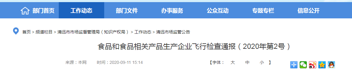 中國質(zhì)量新聞網(wǎng)訊 9月11日,廣東省清遠市市場監(jiān)管局官網(wǎng)發(fā)布食品和食品相關(guān)產(chǎn)品生產(chǎn)企業(yè)飛行檢查通報(2020年第2號)。