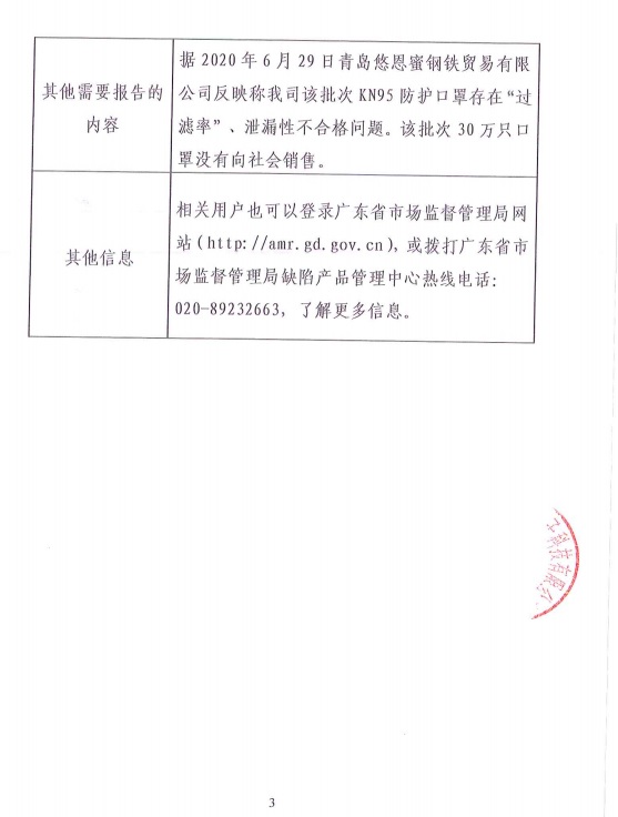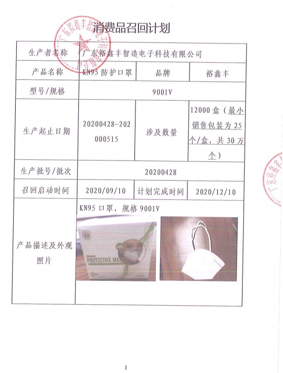本次召回范圍內(nèi)的KN95防護口罩,由于過濾效率不足和泄漏性不符合安全要求,可能導(dǎo)致口罩防護效果受影響,存在一定安全隱患。對于召回范圍內(nèi)的KN95防護口罩,廣東裕鑫豐智造電子科技有限公司將積極落實企業(yè)主體責(zé)任,開展缺陷產(chǎn)品召回、安全技術(shù)改進(jìn)工作,提升產(chǎn)品安全水平,重新更換合格的KN95防護口罩給客戶,以消除安全隱患。