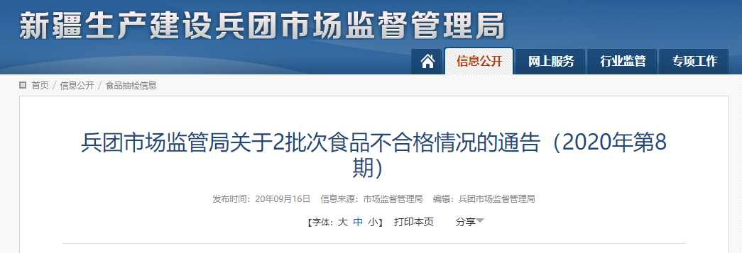 中國(guó)質(zhì)量新聞網(wǎng)訊 (記者 徐遠(yuǎn)官) 9月16日,新疆生產(chǎn)建設(shè)兵團(tuán)市場(chǎng)監(jiān)督管理局官網(wǎng)發(fā)布通告稱,近期,該局組織食品安全監(jiān)督抽檢,抽取淀粉及淀粉制品、豆制品、蜂產(chǎn)品、罐頭、酒類、糧食加工品、肉制品、乳制品、食用農(nóng)產(chǎn)品等12類食品144批次樣品,抽樣檢驗(yàn)合格樣品142批次,不合格樣品2批次。發(fā)現(xiàn)問(wèn)題主要是其他污染物超標(biāo)等問(wèn)題。具體情況如下: