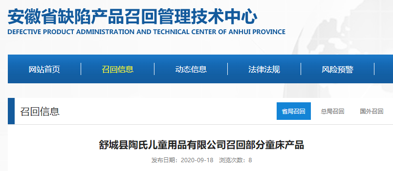中國(guó)質(zhì)量新聞網(wǎng)訊 據(jù)安徽省缺陷產(chǎn)品召回管理技術(shù)中心網(wǎng)站9月18日消息,日前,舒城縣陶氏兒童用品有限公司按照《消費(fèi)品召回管理暫行規(guī)定》的要求,向安徽省市場(chǎng)監(jiān)督管理局、六安市市場(chǎng)監(jiān)督管理監(jiān)督局備案了召回計(jì)劃,決定自2020年08月17日起召回2020年05月01日至05月15日生產(chǎn)的該批次YBL-T2實(shí)木嬰兒床,受影響的產(chǎn)品數(shù)量為20件。