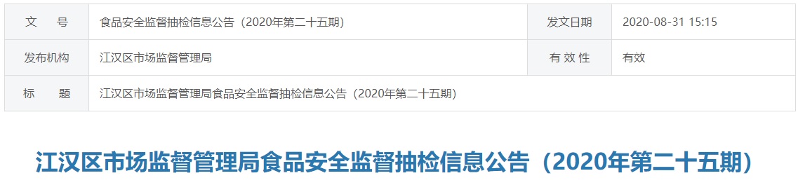 中國質(zhì)量新聞網(wǎng)訊 (記者 陳娟女)據(jù)武漢市江漢區(qū)人民政府網(wǎng)站消息,江漢區(qū)市場監(jiān)督管理局發(fā)布食品安全監(jiān)督抽檢信息公告(2020年第二十五期)。