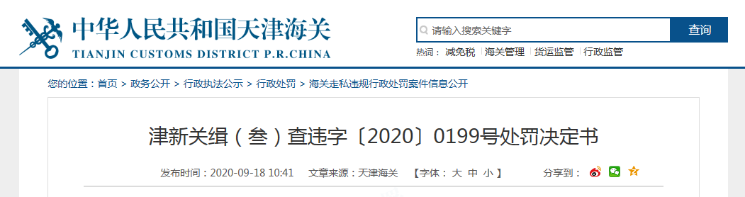 津新關(guān)緝(叁)查違字〔2020〕0199號處罰決定書