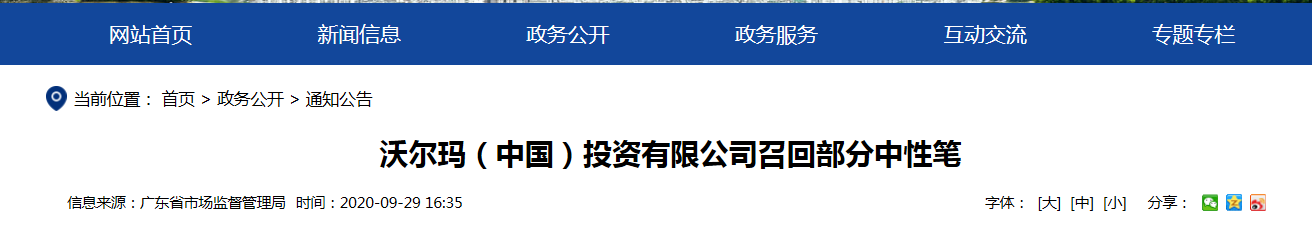 本次召回范圍內(nèi)的中性筆,雖有警示說明,但小零件警告語字體過小,且缺少“危險”、“警告”、“注意”等安全警示的小零件警告語,不容易引起消費者注意,可能造成因監(jiān)護不當(dāng)或誤用而受傷的危險。對于召回范圍內(nèi)的中性筆,沃爾瑪(中國)投資有限公司將積極落實企業(yè)主體責(zé)任,開展缺陷產(chǎn)品召回、安全技術(shù)改進工作,提升產(chǎn)品安全水平,為購買到缺陷產(chǎn)品的消費者退貨退款,以消除安全隱患。