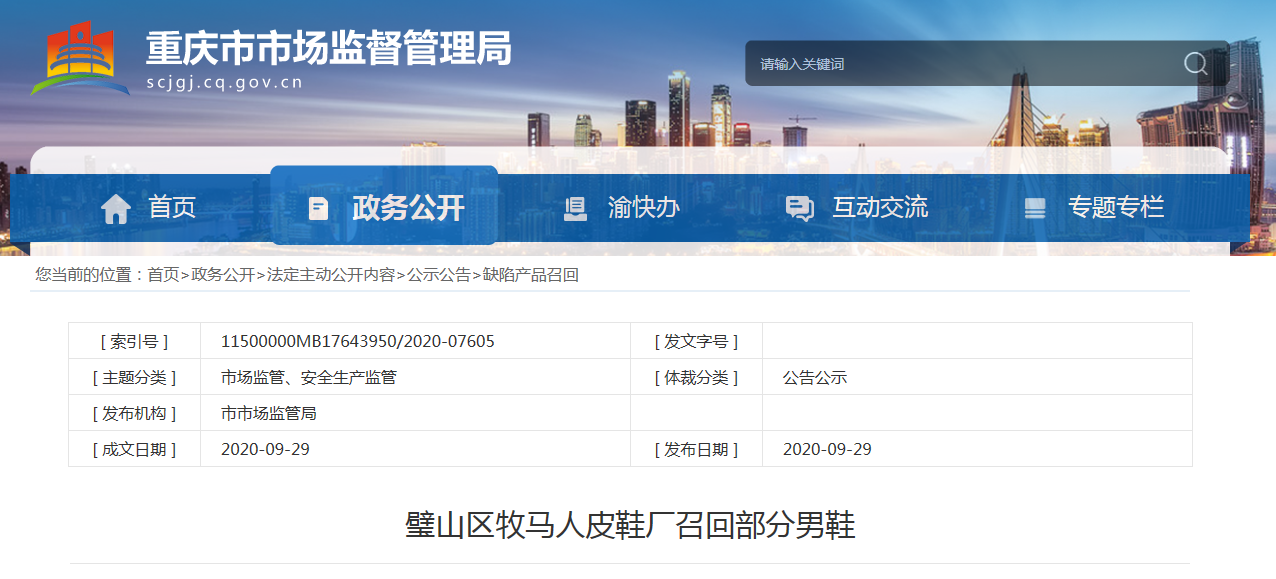 中國質(zhì)量新聞網(wǎng)訊(記者 徐遠官) 據(jù)重慶市市場監(jiān)管局網(wǎng)站9月29日消息,日前,璧山區(qū)牧馬人皮鞋廠按照《消費品召回管理暫行規(guī)定》的要求,向重慶市市場監(jiān)督管理局報告了召回計劃,將自即日起,召回2020年6月20日期間制造的型號為250的男鞋,涉及數(shù)量為20雙。