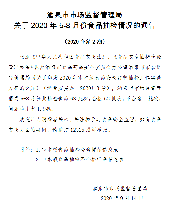 中國質(zhì)量新聞網(wǎng)訊 (記者 徐遠(yuǎn)官) 9月30日,甘肅省酒泉市市場監(jiān)督管理局官網(wǎng)發(fā)布2020年5-8月份食品抽檢情況。本次共抽檢62批次食品,檢出1批次不合格。